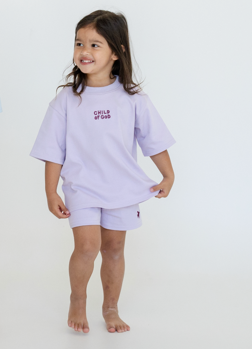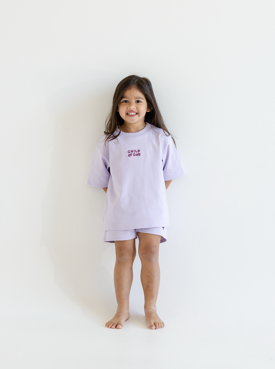 A buttery-soft matching tee and shorts set — the perfect everyday outfit. Features our embroidered Child of God tee and matching shorts with a tiny dove symbolising peace and God’s covering over your little one.